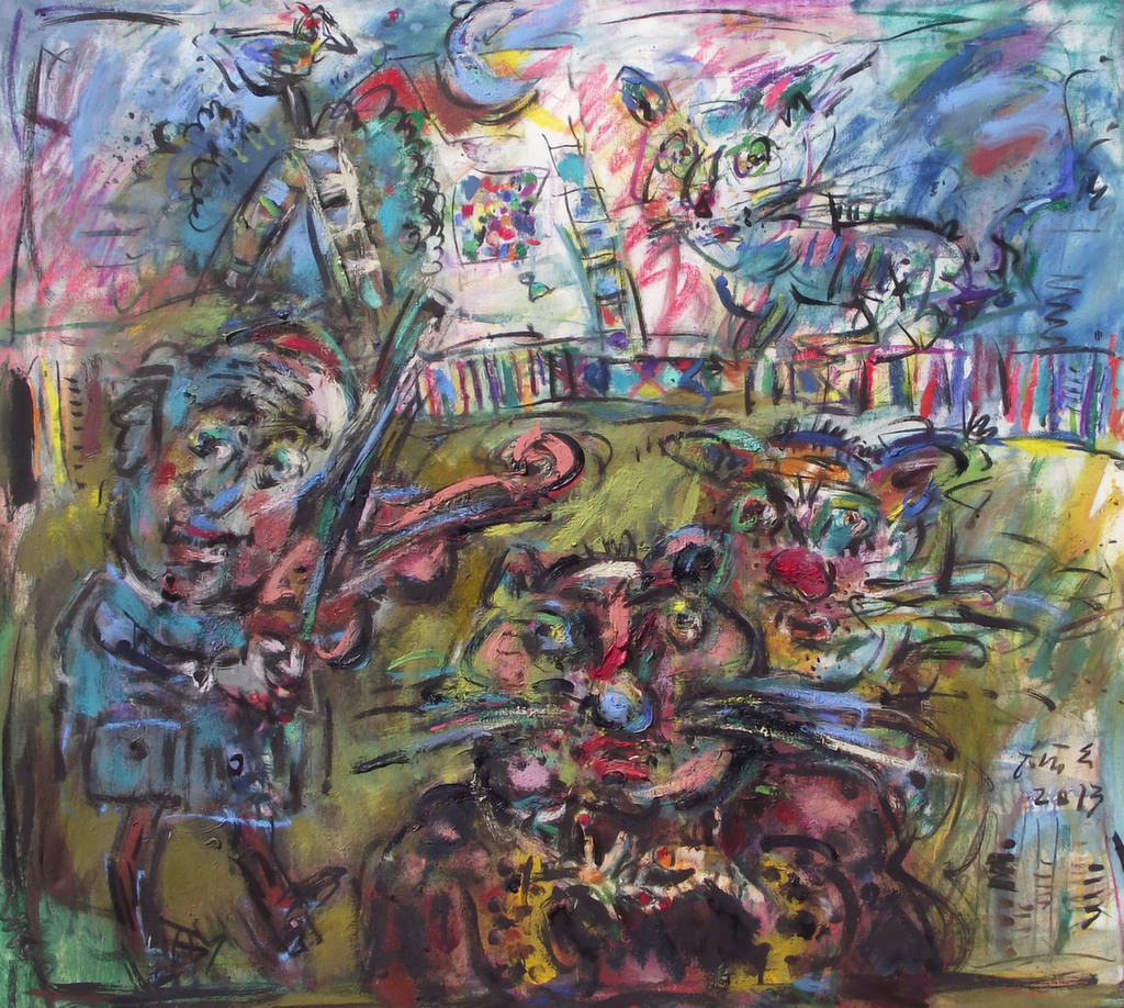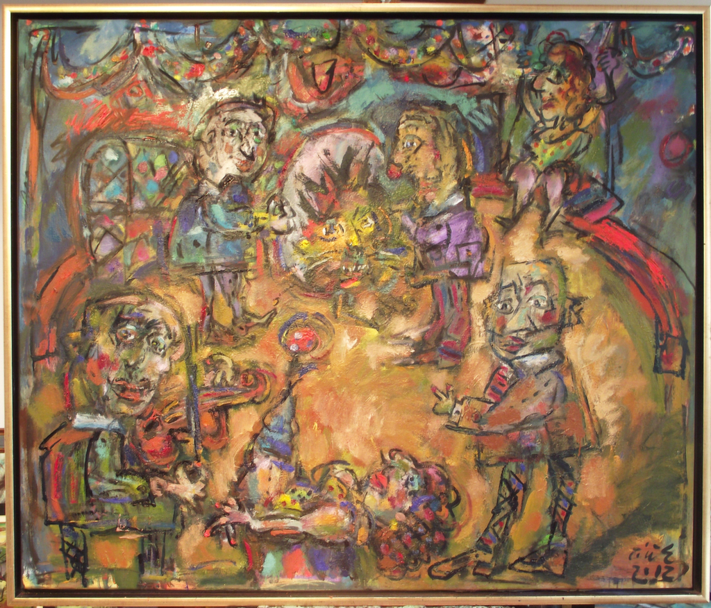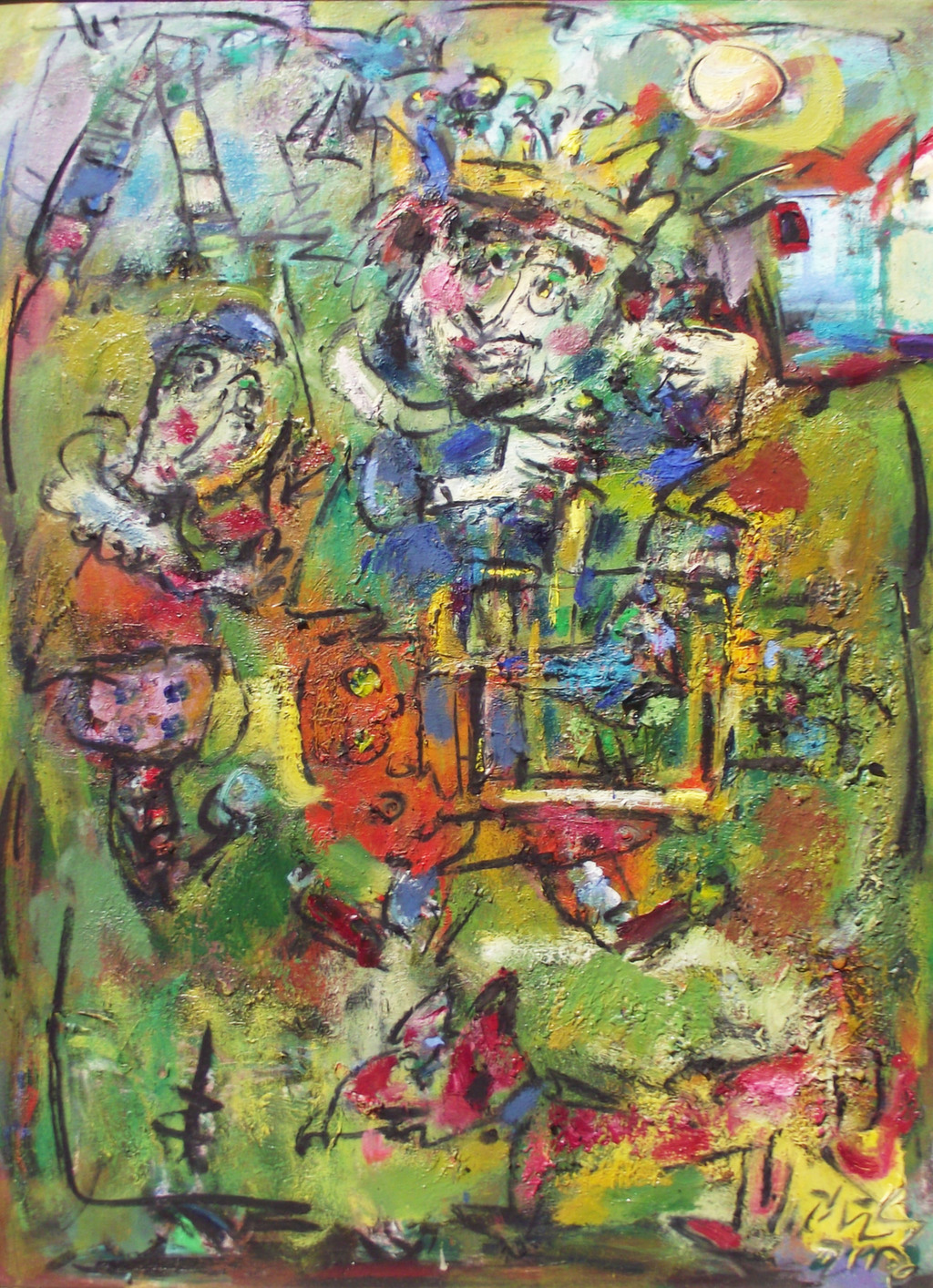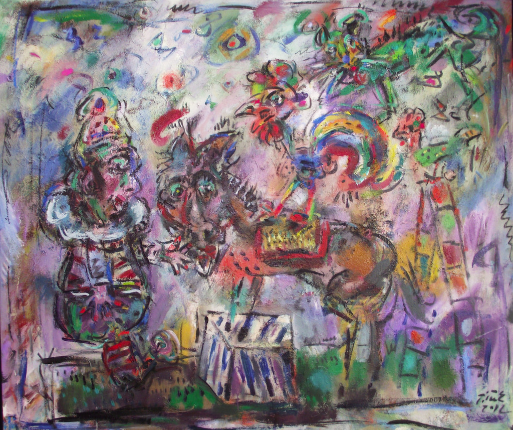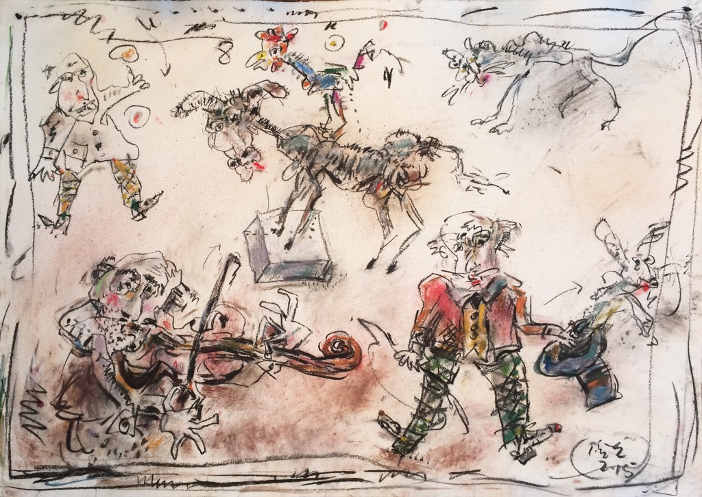 Tóth Ernő érdekes kunkort tett meg a művészeti ágak dzsungelében. A képzőművészeti gimnáziumban szobrász szakos volt, a főiskolán festészetet tanult a Szőnyi István-i hagyományokat folytató Iván Szilárdnál, majd hosszú éveken át díszletszobrászként dolgozott az Operaházban, s nagy, festői foltokra alapozott lírai jeleneteket festett, míg az utóbbi 5-10 évben festményein is a rajznál kötött ki és bronzszobrait is térbeli rajzoknak tekinti. Pedig egy ide is elhozott festménye, a kiállítás indítóképe, a Bohóc kaméleonnal, 1991-ből azt mutatja, hogy a kolorithoz, a gesztusokhoz, a nagyformához és a heroikusabb fogalmazásmódhoz is van érzéke. Gyermeki stílusban megfogalmazott, mégis erőt sugárzó monumentális, szinte mitikus tűzben égő bohócának hatalmas keze kreatív erőt áraszt, látomásszerűen nyúl a mindig színét változtató kaméleon felé, Blake asszociációkat keltve és a COBRA csoport, például Karel Appel erőteljes, már-már erőszakos festőiségét idézve. Ennek ellenére Tóth Ernő az elmúlt 15 évben a grafikus jelleg, sőt - a modernizmusban lenézett, majd a posztmodernben újra felértékelt - karikatúra, narratívitás és groteszk humor mellett döntött. Az ezernyi apró lény és részlet perpetuum mobiléjában nyilván saját vibráló, izgága személyisége - egyfajta horror vacui érzése - is motiválta. De talán atomjaira széteső, kisstílű, önző és erőszakosan nyomuló korunk is sarkallta abban, hogy vásznait és merített papírlapjait az összes emberi hibát mértéktelenség, hazugság, gőg, ostobaság, nagyzolás, képmutatás, hajbókolás teljes erőbedobással elkövető, de humorban és szeretetben megfürdetett figuráinak folyamatos nyüzsgésével borítsa be. Szemléletét alapvetően meghatározza a színház és a cirkusz, minden alkotása egy-egy commedia delarte jelenet, parabola, fabula. Művein, mint egy nagy mesegyűjteményben vagy kertben visszatérő figurák, főleg bohócok, krampuszok, don-quijoték, münchausenek, széphölgyek és megszemélyesített állatok tűnnek fel, sétálnak és szerepelnek színről-színre, az emberi balgaságot megjelenítve. Festményeinek főszereplője a csíkos ruhás bohóc, akinek csetlő-botló alakjában talán nem túlzás némi önarcképi jelleget feltételezni. Ez az önirónia is jelzi, hogy Tóth Ernő - a groteszk szemléletben és a maszkhasználatban előfutárának számító, de az emberiséggel szemben megvető James Ensorral ellentétben - nem bánik kajánul ábrázoltjaival, nem ítélkezik fölöttük, megértő szeretettel jeleníti meg olykor értelmetlen vagy kifogásolható cselekedeteiket. Világosan látja, hogy egyáltalán nem tanulunk mások kárából, még a magunkéból sem, s az is egyértelmű, hogy mindannyian oda vagyunk egy kicsit kozmálva - ahogy Hamvas Béla mondta. Tóth a legabszurdabb tettből is vidám karneváli, báli jelenetet, szüreti mulatságot formál. Visszatérő képtémája az emberi nagyra törést kifigurázó Brémai muzsikusok, amelyet - a kiállítás címéhez híven festményben és szoborban is élvezhetünk. Az állatok gúlája csak nagy nehezen áll össze, egyik oldalról egy bohóc szalmával csalogatja, míg hátulról egy másik a hátsó felét tolja a csökönyös szamárnak, s a girhes macska is csak az utolsó pillanatban ugrik be a helyére. Az alakzat létrejötte nem is az ügyetlen ember akaratának, hanem a hegedülő kecske varázsénekének köszönhető. A többször visszatérő motívum mintha csak a Tóth Ernő-i formavilágot befolyásoló Marc Chagall hegedűs alakjainak karikatúrája lenne. Az előtérben, a porondmester figurájában Danny de Vitora ismerhetünk, aki Tim Burton Big Fish című filmjéből érkezett a képbe, s a szív alakú lábbal kötélen lengő, zsonglőrködő bohócokat körülvevő jelenésszerű, vidám buborékok is a filmből származnak. Egy sor más művét inspirálták filmek és zeneművek, nyilván a legfontosabb közülük Fellini Bohócokja, amely a Tóth Ernő ikonográfiájában központi szerepet betöltő bohóc figurát befolyásolta. Érdekes, hogy Tóth igrice nem kötődik pontosan a commedia delarte-ban vagy a cirkuszban megszokott típusokhoz, tulajdonképpen a fehérarcú rászedett Pierott és csak kicsit gonosz, az ördög szerepét eljátszó, feketearcú Scarpino figuráját támogató, színes ruhájú Harlekin alakjainak vonásait ötvözi. Rászedő, de még inkább rászedett hősszerelmes egyszerre. Ilyen átejtett figurákként jelennek meg a fogyasztói társadalom pusztító étvágyát karikírozó Ki bír többet? című kép egymással gombócevő versenyt vívó, megkettőzött, majd szétpukkadó bohócpárjában. Megáll az eszem, csak eszem, csak eszem - énekelte fe Lugossy Laca a Bizottság együttesben, de az Indul a bakterház zabálói is felvillannak a tarka mű hátterében. Az újdonságot a nagyon is aktuális tartalom jelenti. Nem is annyira a manipulált fogyasztók mohósága, mint inkább a mögöttük álló, őket hergelő és manipuláló, sutyorgó-vigyorgó kibicek - a tőkét kiszolgáló média és PR sunyisága és aljassága kelt bennünk viszolygást. A természetet, a környezetet kizsigerelő konzumidiotizmus veszélyeire Tóth hasonlóképpen játékos, humoros formában hívja fel a figyelmünket, a Kérsz egy pohár vizet? című festményen, melyen egy akváriumba zárt aranyhalnak vizet vivő bohóc tűnik fel. A művészet természetesen sosem csak a témát hordozó üzenet, hanem a művészi eszközökkel való játék is. Bár Tóth Ernő a rajzra helyezi a hangsúlyt munkáiban, itt szeretnék rámutatni arra az akvárium vizének felületén úszkáló Czóbel Bélát, Jean Dubuffet-t és Karel Appelt is megidéző festői reflexre, amely azt mutatja, hogy a grafikai nyelvben önmagát szűk területre korlátozó Tóth hogy